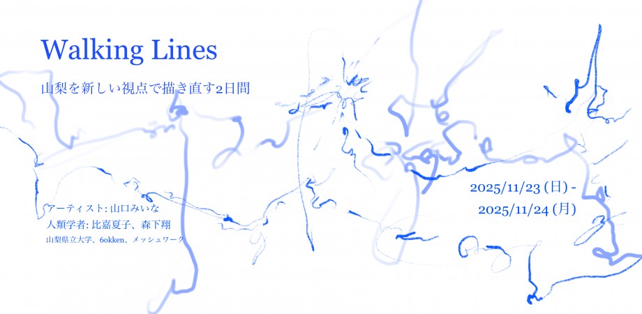 2日間にわたり、参加者は河口湖周辺を歩き、そこに存在しうるさまざまな「線」を発見し、自らの身体を通して描きなおす実践に挑みます。それは、日常の景色に潜む物語を拾いあげ、自分と土地とのつながりを再発見するような試みです。 山梨を「線」によって読み解き、想像しなおすこの時間は、アートと人類学が交差する場であり、参加者ひとりひとりのまなざしが織り合わされる場でもあります。