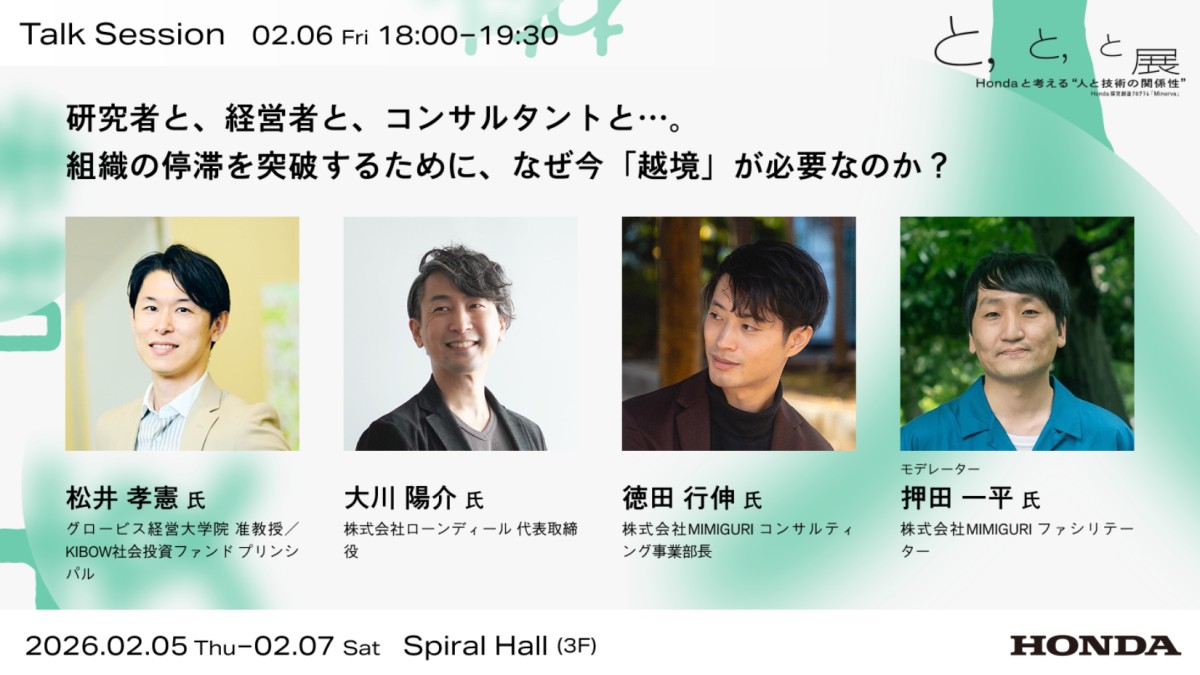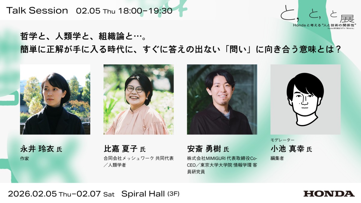 メッシュワークは人類学の視点からHondaの従業員向け探究創造プログラム “Minerva” に携わり、約1年間伴走してきました。その活動報告として、2月5日(木)から7日(土)の3日間にわたり『 と、 と、 と展 Hondaと考える“人と技術の関係性”』と題した最終発表会が開催されます。